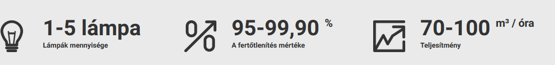 A  légtisztítóban lévő lámpák sugárzása elegendő a helyiségben található összes mikroorganizmus elpusztításához .A  levegőfertőtlenítés hatékonysága a DEZAR UV- légtisztító modelljétől függően 95-99,9% .